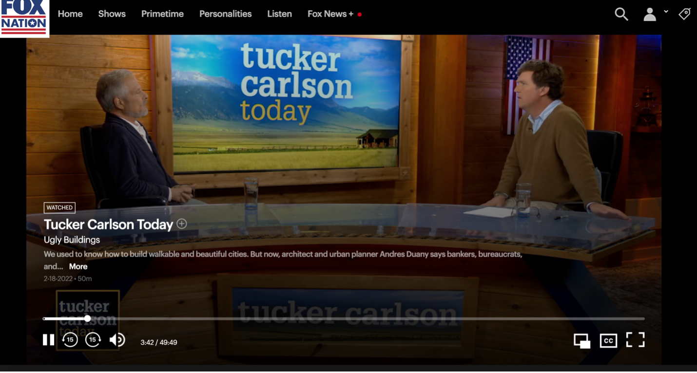 You may have been surprised to see that Andres was the guest for the entire hour of this week’s episode of Tucker Carlson’s FOX NATION podcast “Tucker Carlson Today.” The two had a long, in-depth conversation about New Urbanism and development in the United States and how the CNU ( “1,500 brilliant well-intentioned people working all the time with passion”) works to try to improve the country’s built environment.