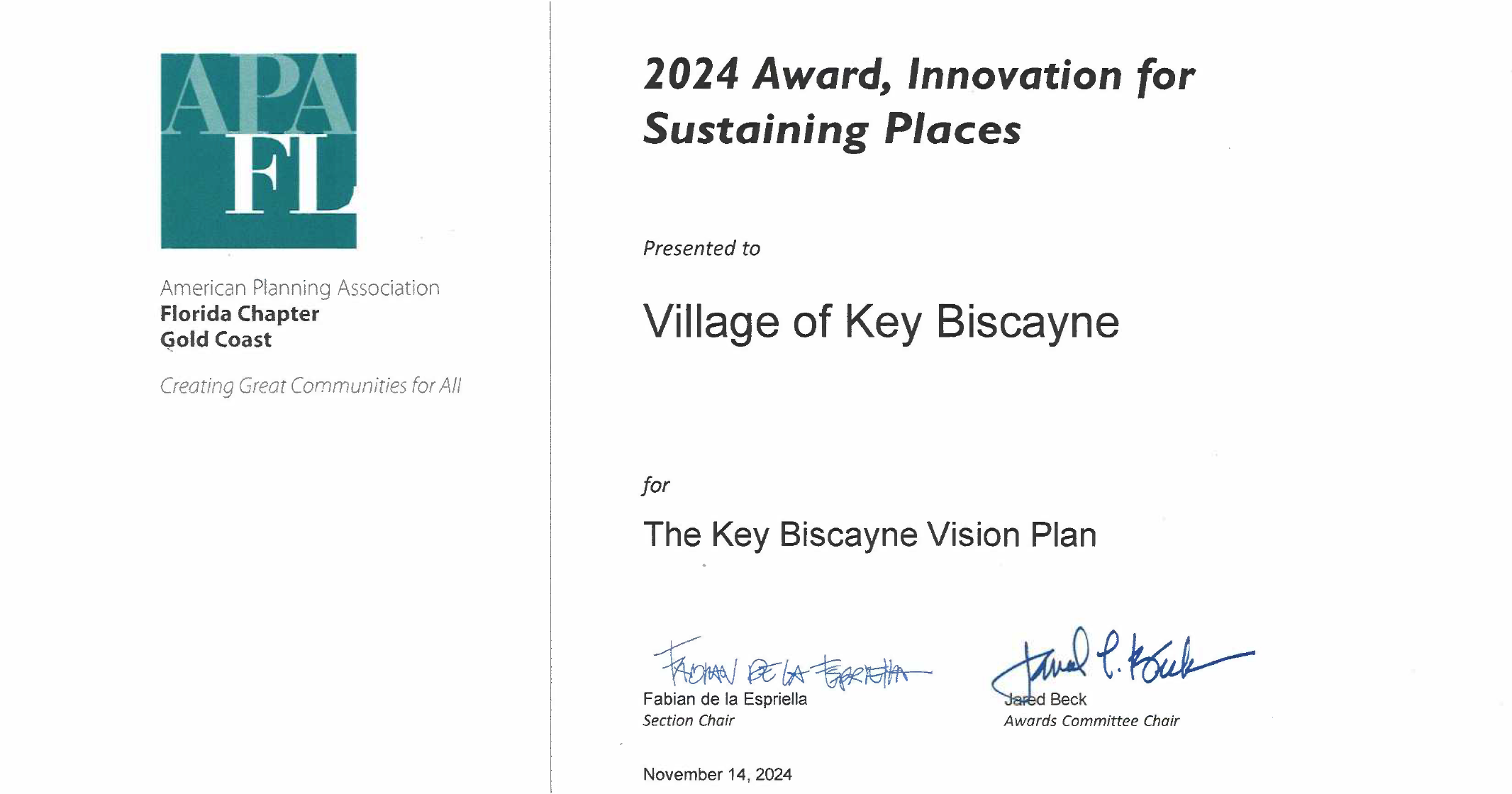 Also in November, the Key Biscayne Vision Plan received the FL Gold Coast Chapter of the American Planning Association award for “Innovation for Sustaining Places”.
