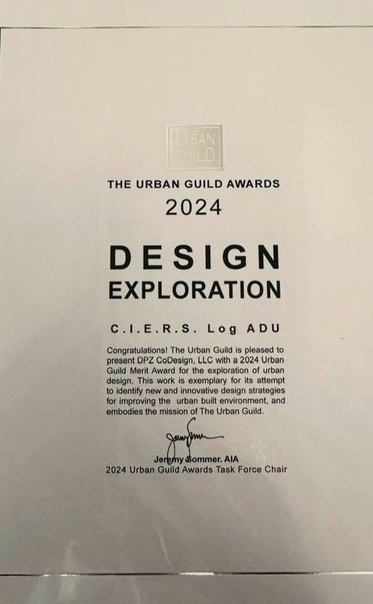 In November, DPZ was recognized at the 2024 Urban Guild’s Annual Summit. The award was for “Design Exploration” and was granted to the affordable housing C.I.E.R.S Log ADU project. Alys Beach Town Architects, Khoury-Vogt Architects, also received 3 awards of their own.