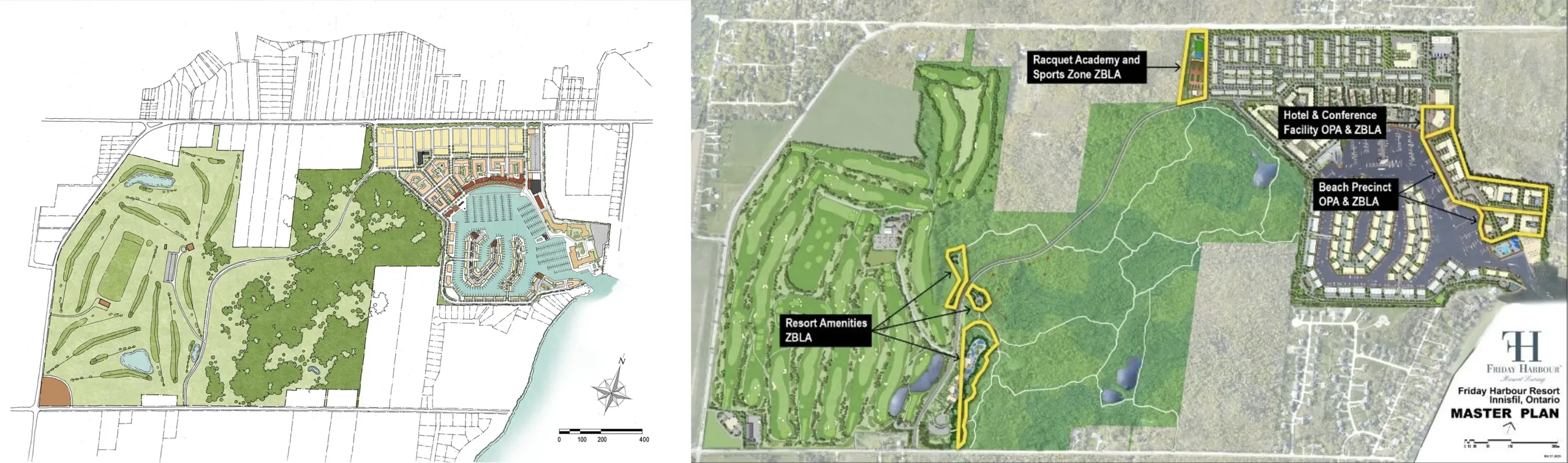 Approved 2007 DPZ masterplan plan for the resort ( left) and updated plan of the resort presented last month to local council with proposed changes to amenities, Beach precinct and Hotel and conference area highlighted (right)