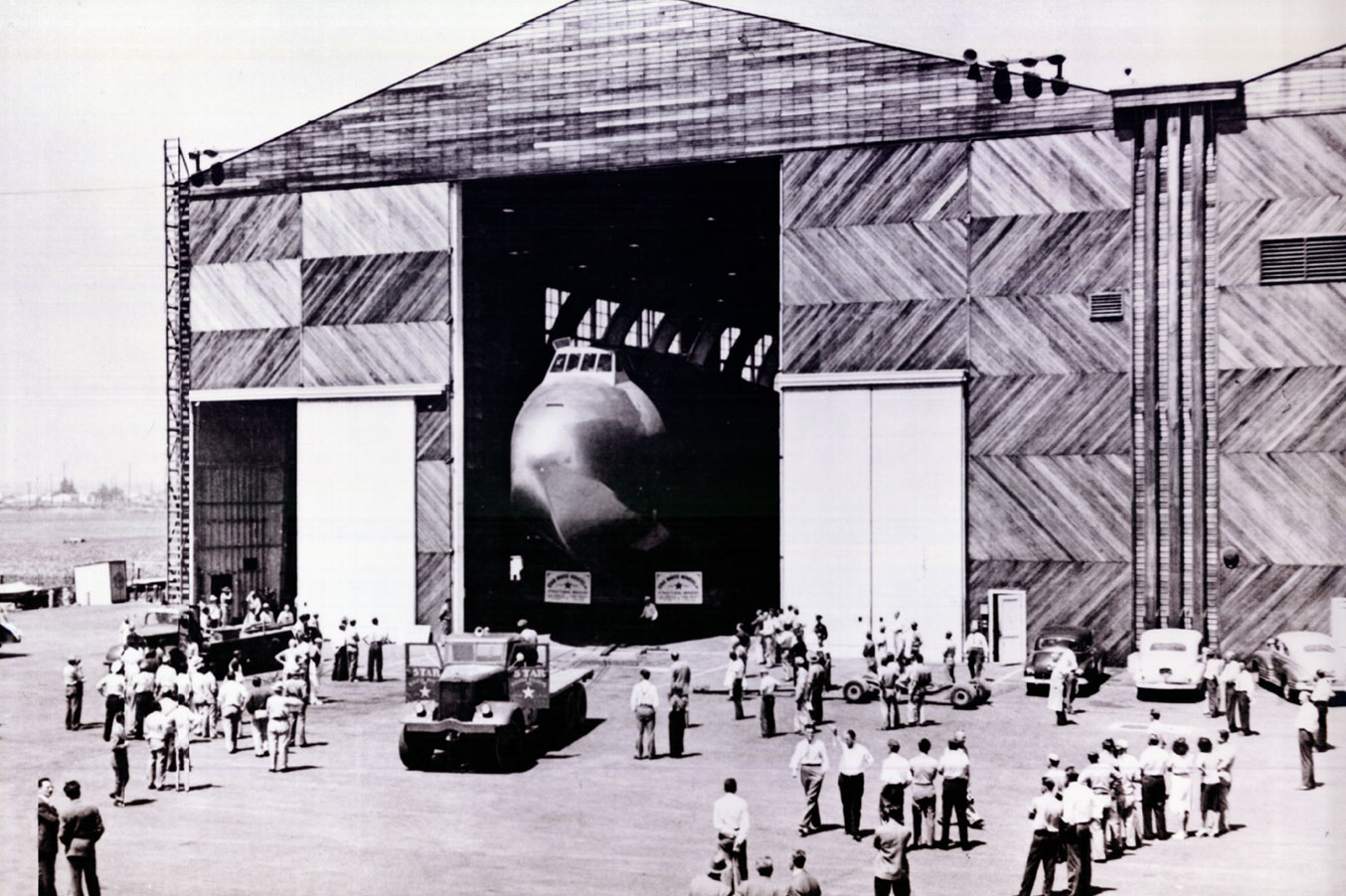 Historic image of the Hughes H-4 Hercules (aka the Spruce Goose) aircraft at a Hughes Airport hangar / Photo courtesy of Playa Vista Institute