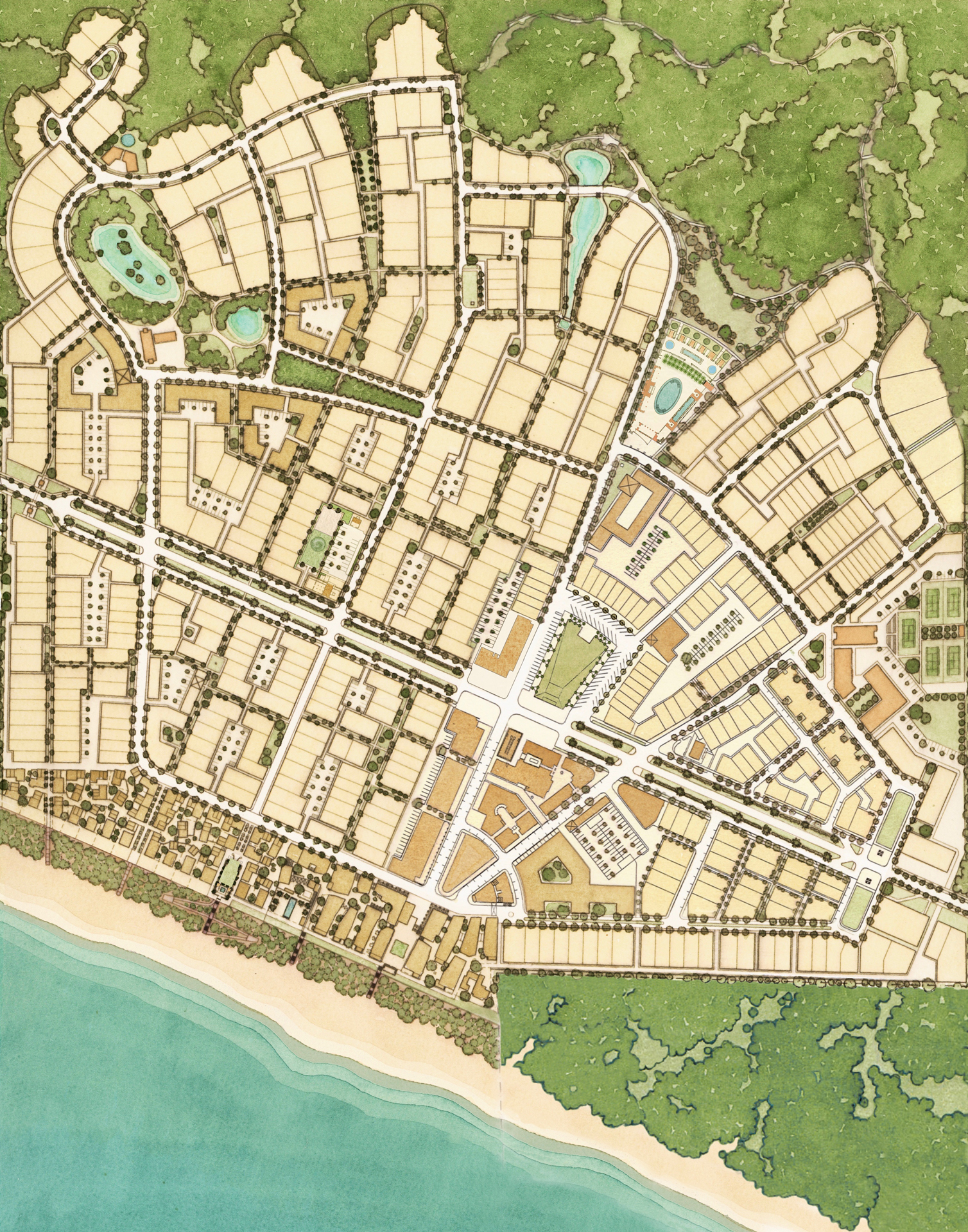 Like nearby Seaside and Rosemary Beach, Alys Beach is another model resort town where an explicitly urban experience lives in harmony with nature. The site offered DPZ the rare opportunity to celebrate the Gulf front to wetland transect that is so emblematic of the Florida Panhandle. Long views to the water from points inland are framed by narrow pedestrian passages filled with fountains, gardens, and outdoor seating. As do the other two communities, Alys announces its presence along County Road 30A emphatically— with bold gateway pavilions, cobble-stone slip roads, date palm allée, and a town center green.