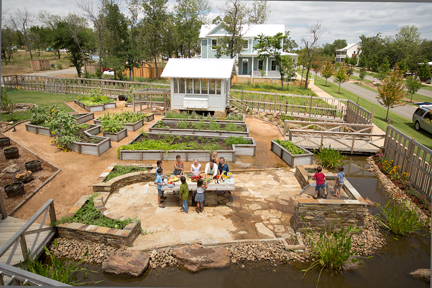 Civic amenities: elementary school, a church, town green pavilion, community pool with clubhouse, and a community garden with nearby facility for management, processing, and sale of produce.