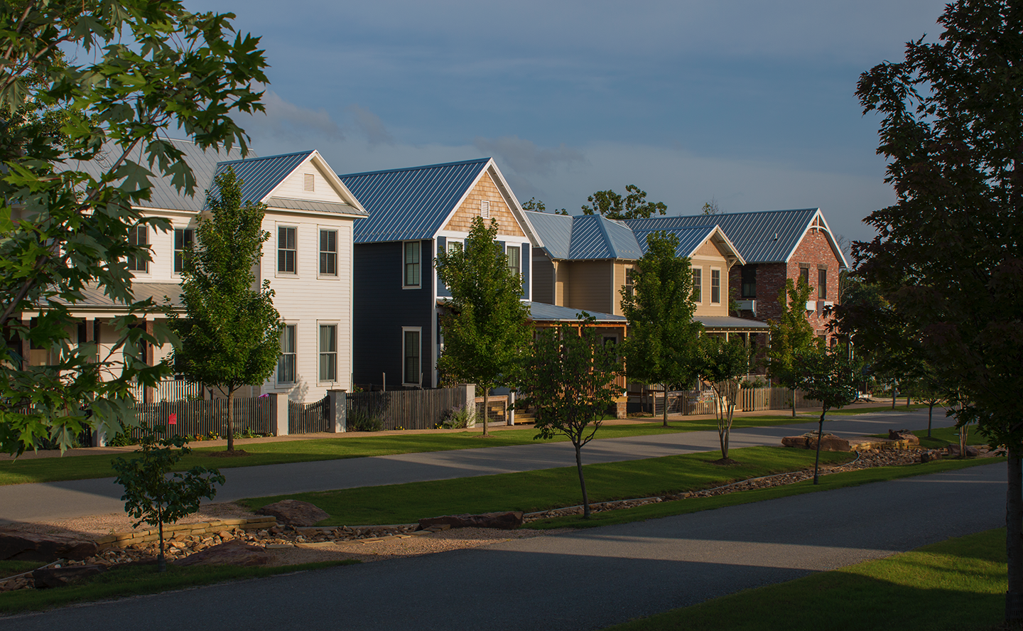Mix of uses: town center shops, restaurants, live/ work units, and generous greens and parks.