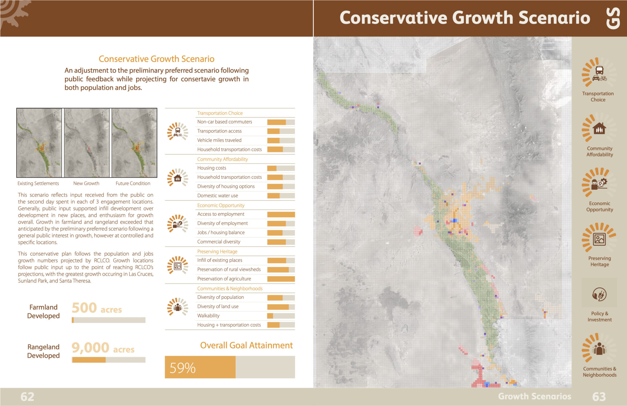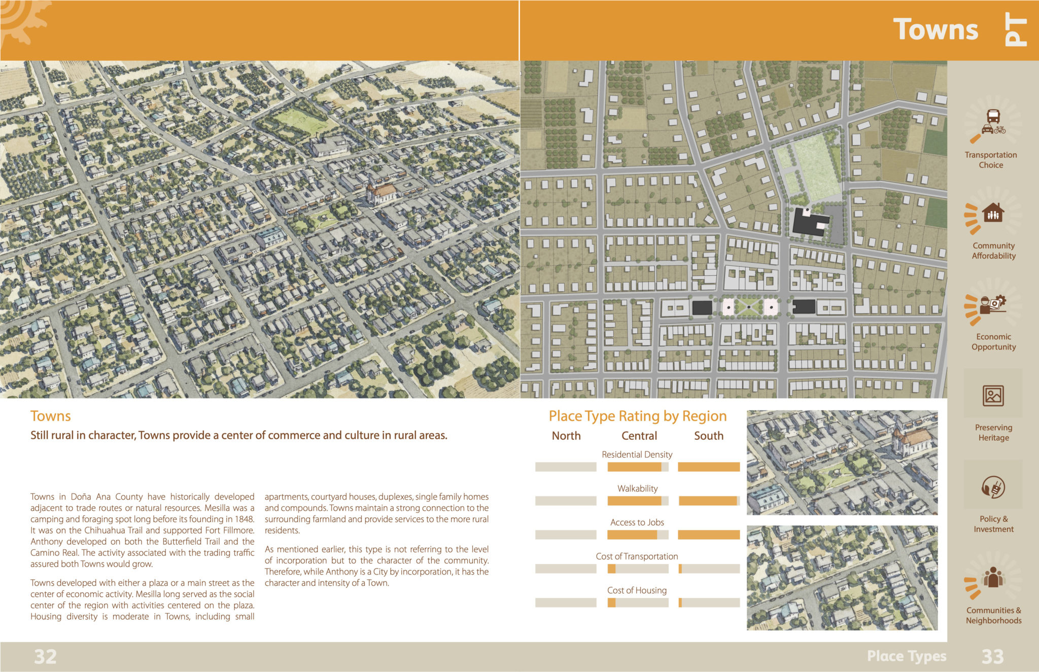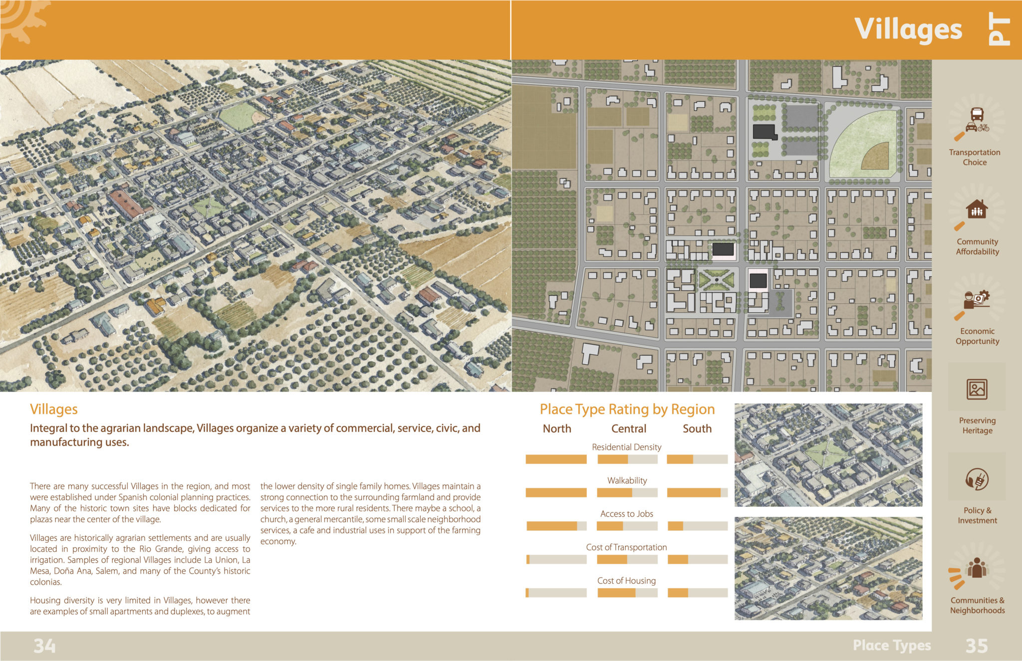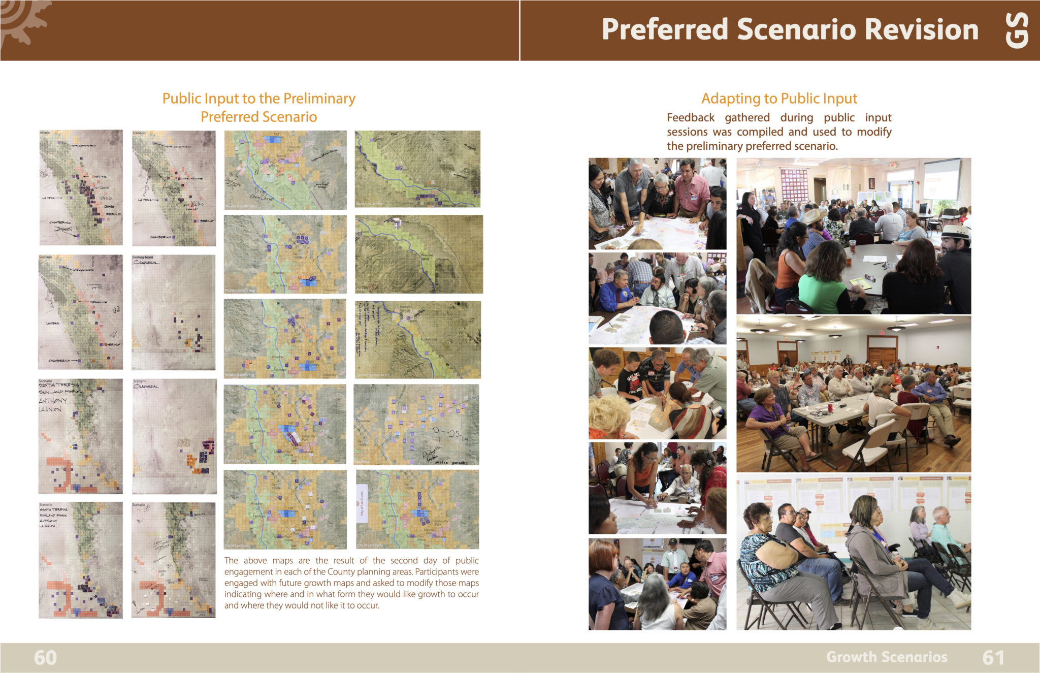 DPZ served as sub-consultants to PlaceMakers for the Dona Ana County Comprehensive Plan update, leading the regional scenario planning process and creation of the future land use sector plan. A series of two-day workshops were held in Anthony, Las Cruces and Hatch, in order to consult with local residents concerning which growth patterns Dona Ana County would aspire to. DPZ developed a scenario planning tool based upon place types, which provided long-term analysis of growth choices, tied to the US Department of Housing and Urban Development’s Livability Principles. Workshop participants engaged with a preliminary future scenario map in groups, eliciting active and productive discussions concerning the County’s future. Feedback provided by participants was incorporated into the final growth scenarios, reflected in the scenario report. The preferred growth scenarios formed the basis for the sector plan, which guides the location and type of future growth through the County’s Comprehensive Plan.