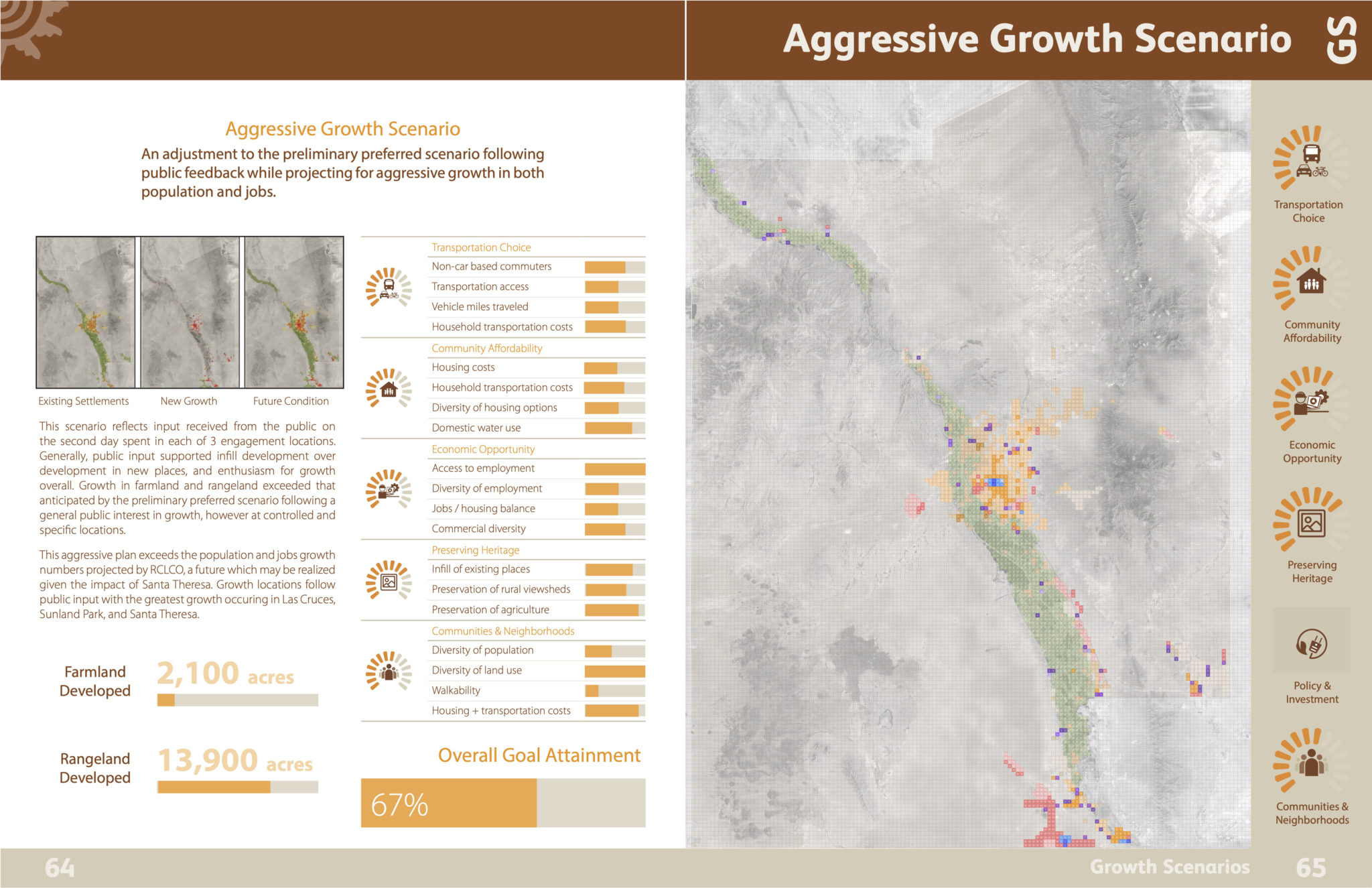 DPZ served as sub-consultants to PlaceMakers for the Dona Ana County Comprehensive Plan update, leading the regional scenario planning process and creation of the future land use sector plan. A series of two-day workshops were held in Anthony, Las Cruces and Hatch, in order to consult with local residents concerning which growth patterns Dona Ana County would aspire to. DPZ developed a scenario planning tool based upon place types, which provided long-term analysis of growth choices, tied to the US Department of Housing and Urban Development’s Livability Principles. Workshop participants engaged with a preliminary future scenario map in groups, eliciting active and productive discussions concerning the County’s future. Feedback provided by participants was incorporated into the final growth scenarios, reflected in the scenario report. The preferred growth scenarios formed the basis for the sector plan, which guides the location and type of future growth through the County’s Comprehensive Plan.