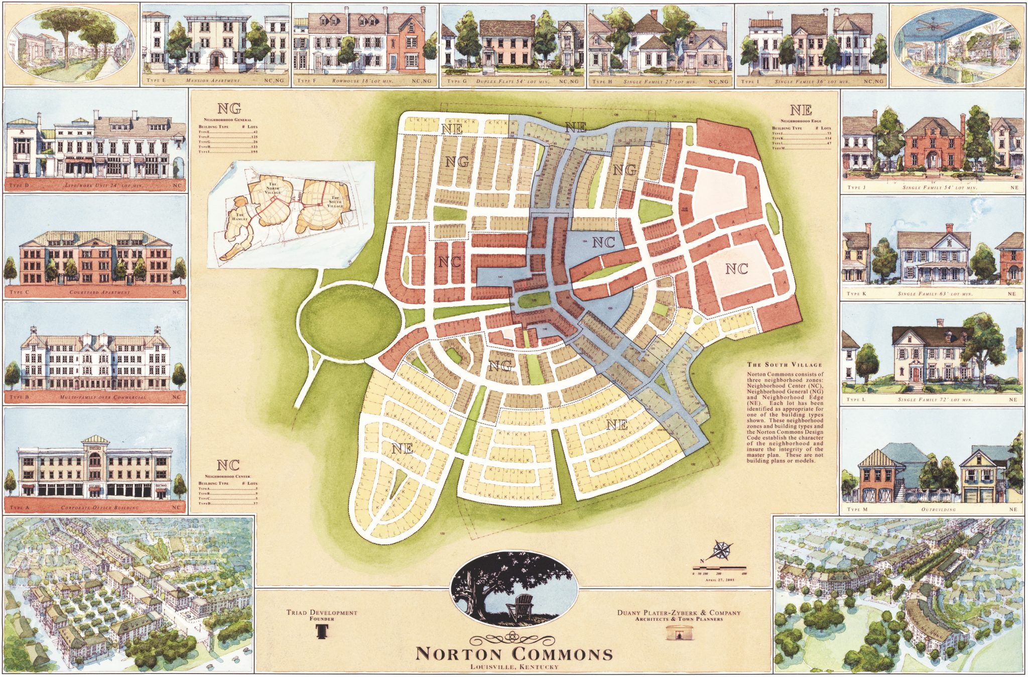 Town founders David Tomes and Charles Osborne have continued Louisville’s tradition of elegantly planned neighborhoods and parks with their 1997 DPZ master plan. It took a special zoning ordinance and 7 years of aligning all the necessary ingredients, including a Steve Mouzon pattern-book to guide homebuilders that has been ably administered by Town Architect Mike Watkins. Since 2004 Norton Commons has been steadily growing as it largely ignored the recession.