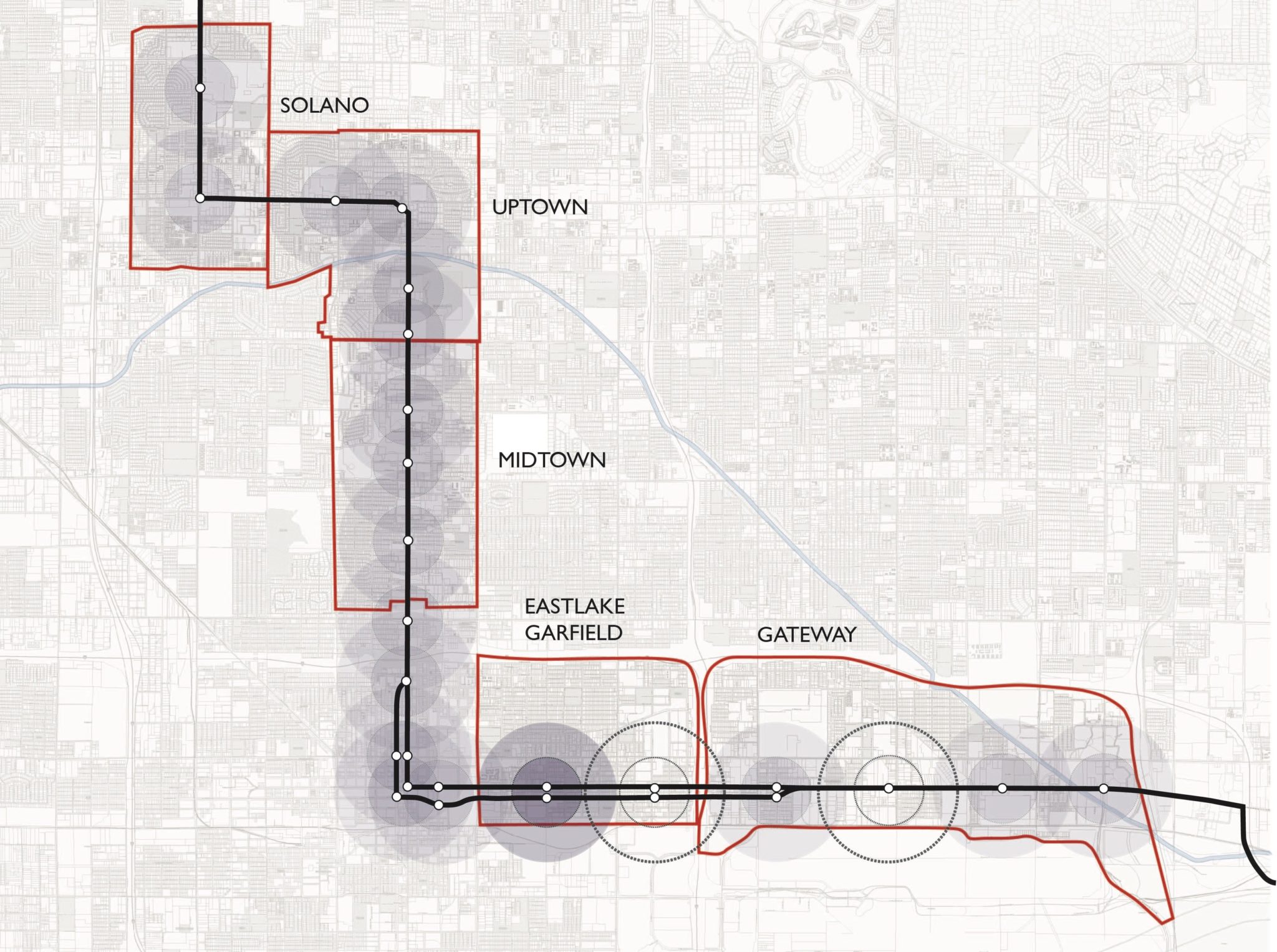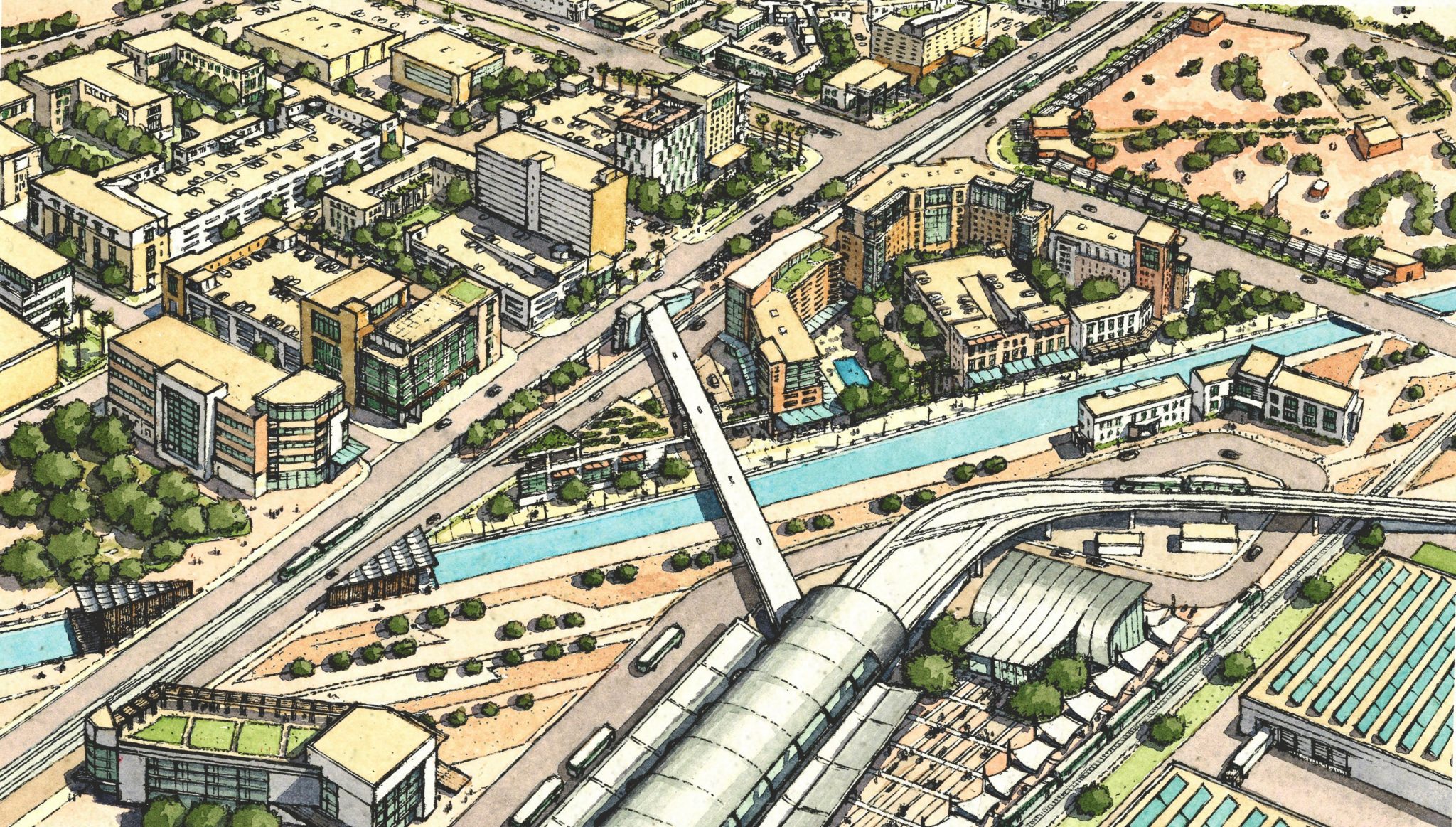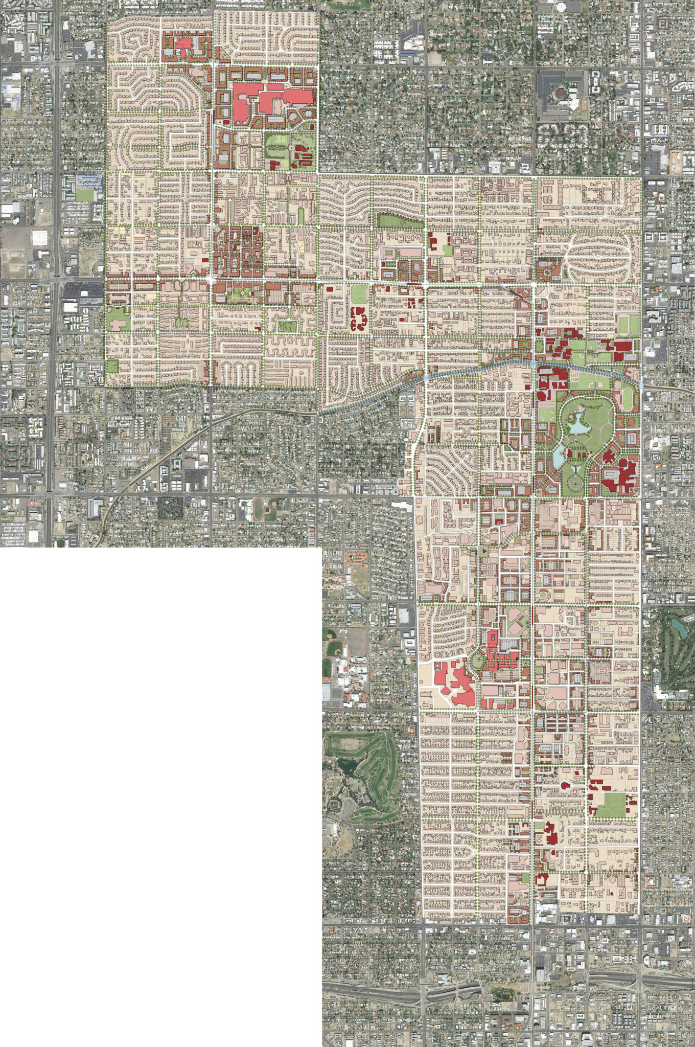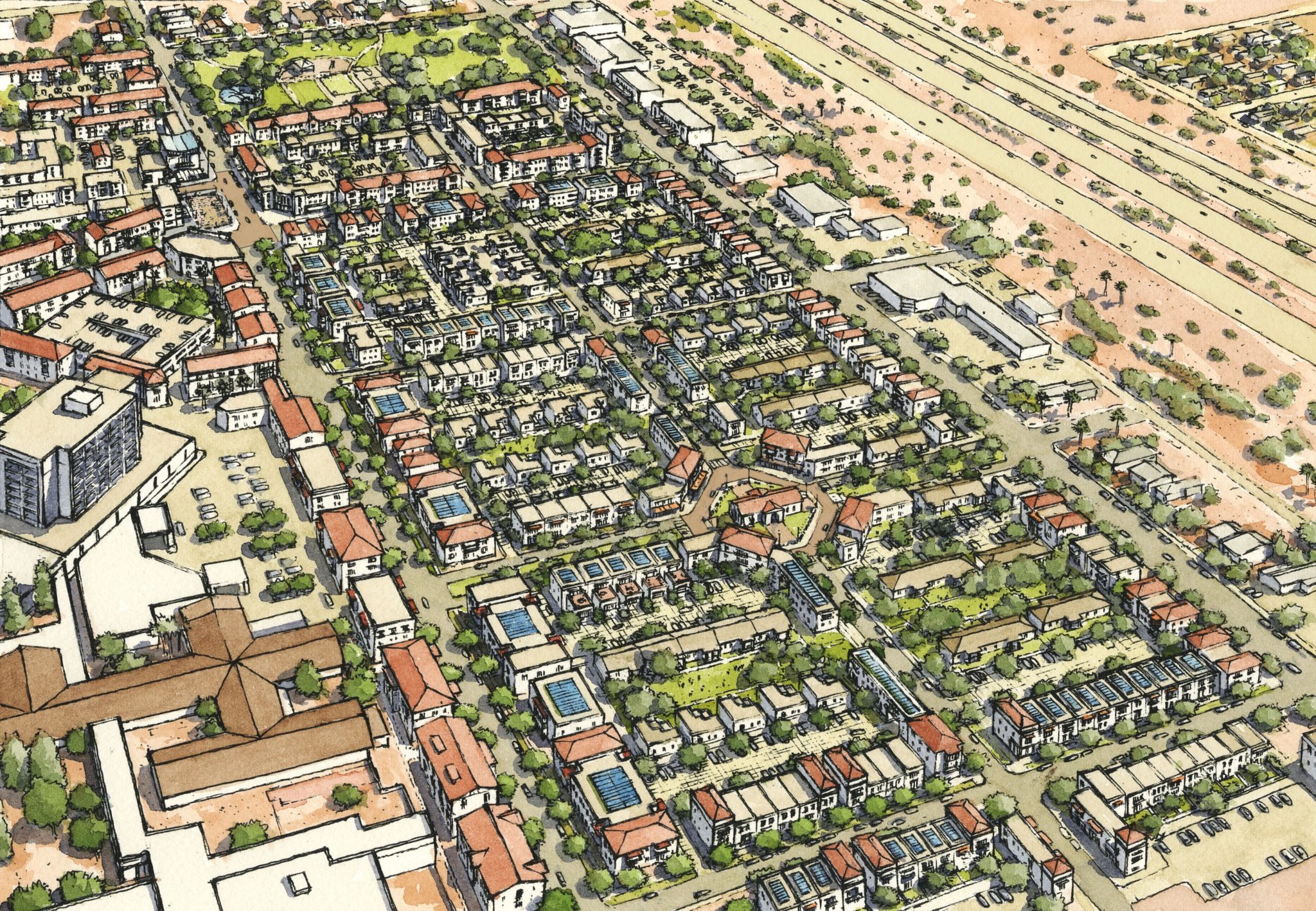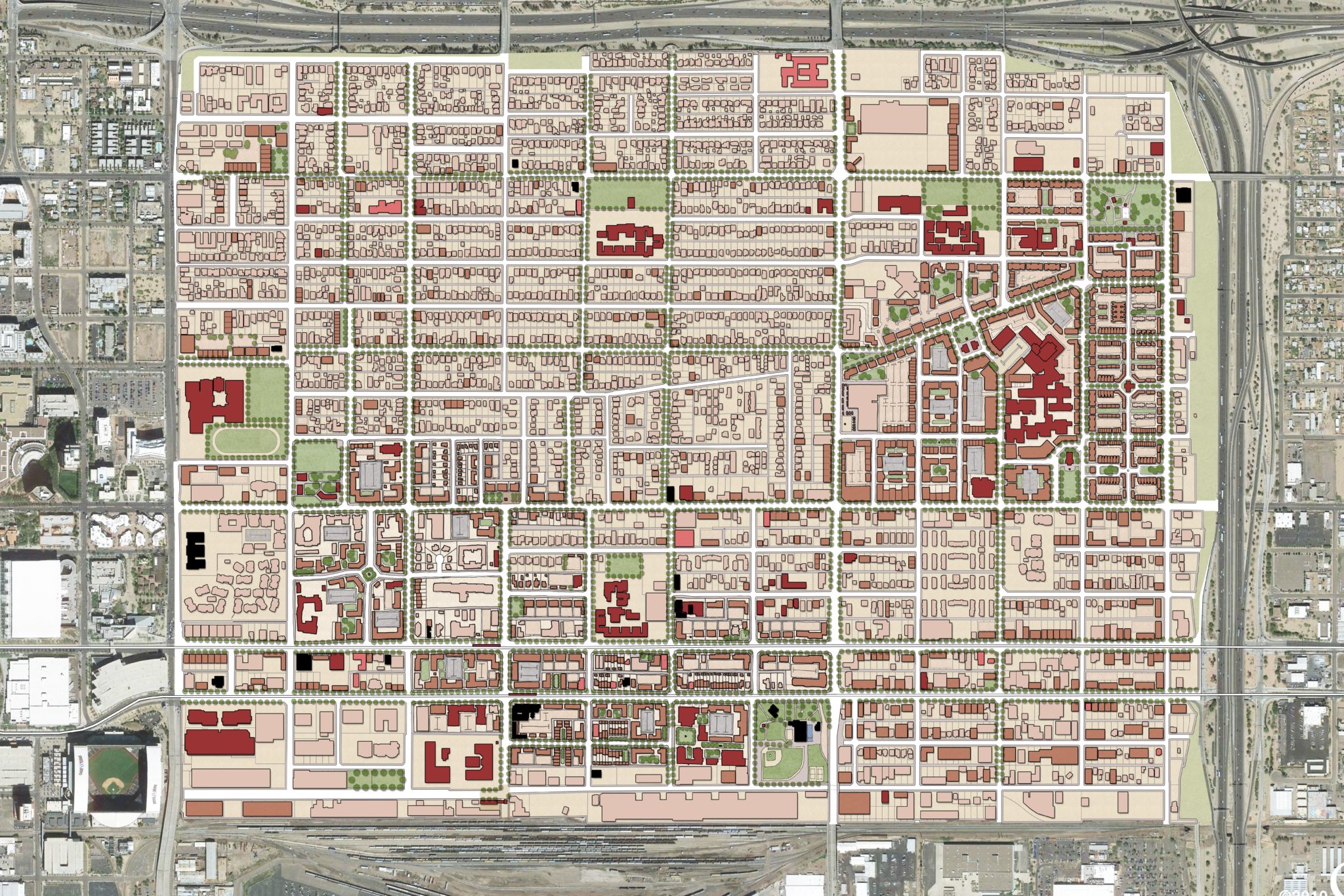 Made possible by a HUD Community Challenge Grant from the Office of Sustainable Housing and Communities, the Reinvent PHX initiative enabled a new vision for a more livable and equitable development future, beginning along Phoenix’s Valley Metro light rail corridor. A multidisciplinary team assembled and led by DPZ collaborated with the City’s stellar Planning & Development Department to conduct a series of charrettes in 2013 to study the corridor’s five TOD Districts. The main goal was to produce a Walkable Urban Code that addressed land within 1/2 mile of light-rail stations, but was also meant to stimulate growth beyond the districts. Also participating in the efforts were numerous City agencies, allied partners, Arizona State University (ASU) and St. Luke Health Initiative.