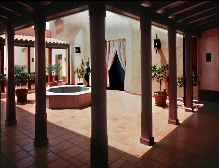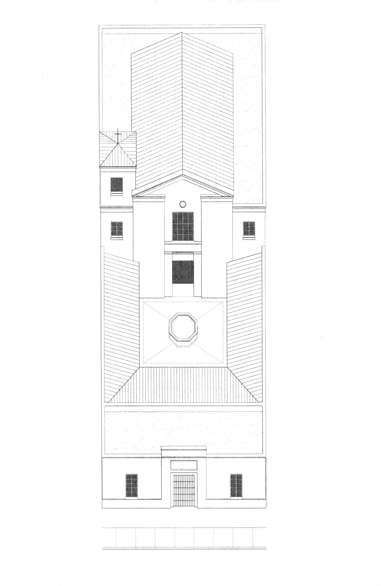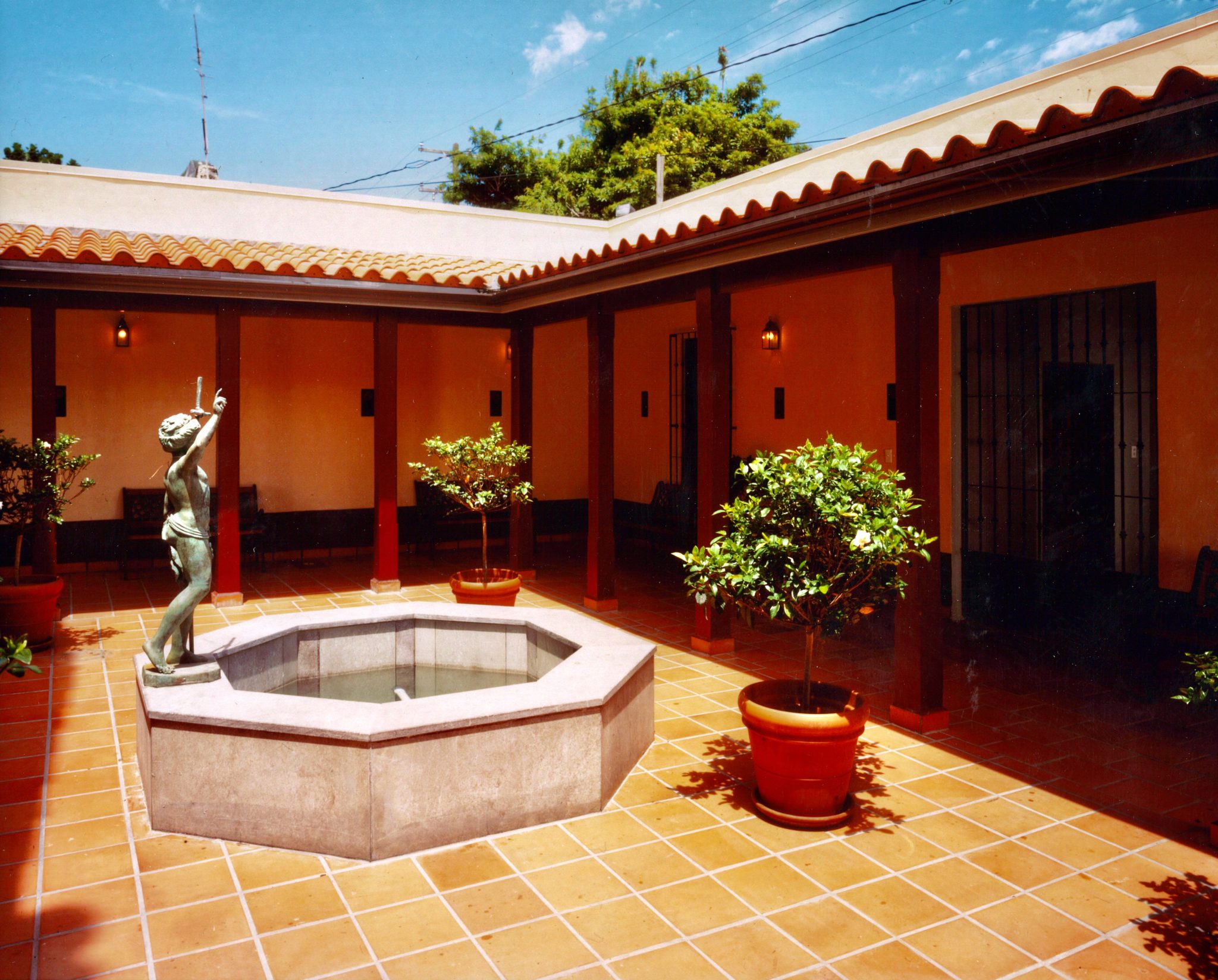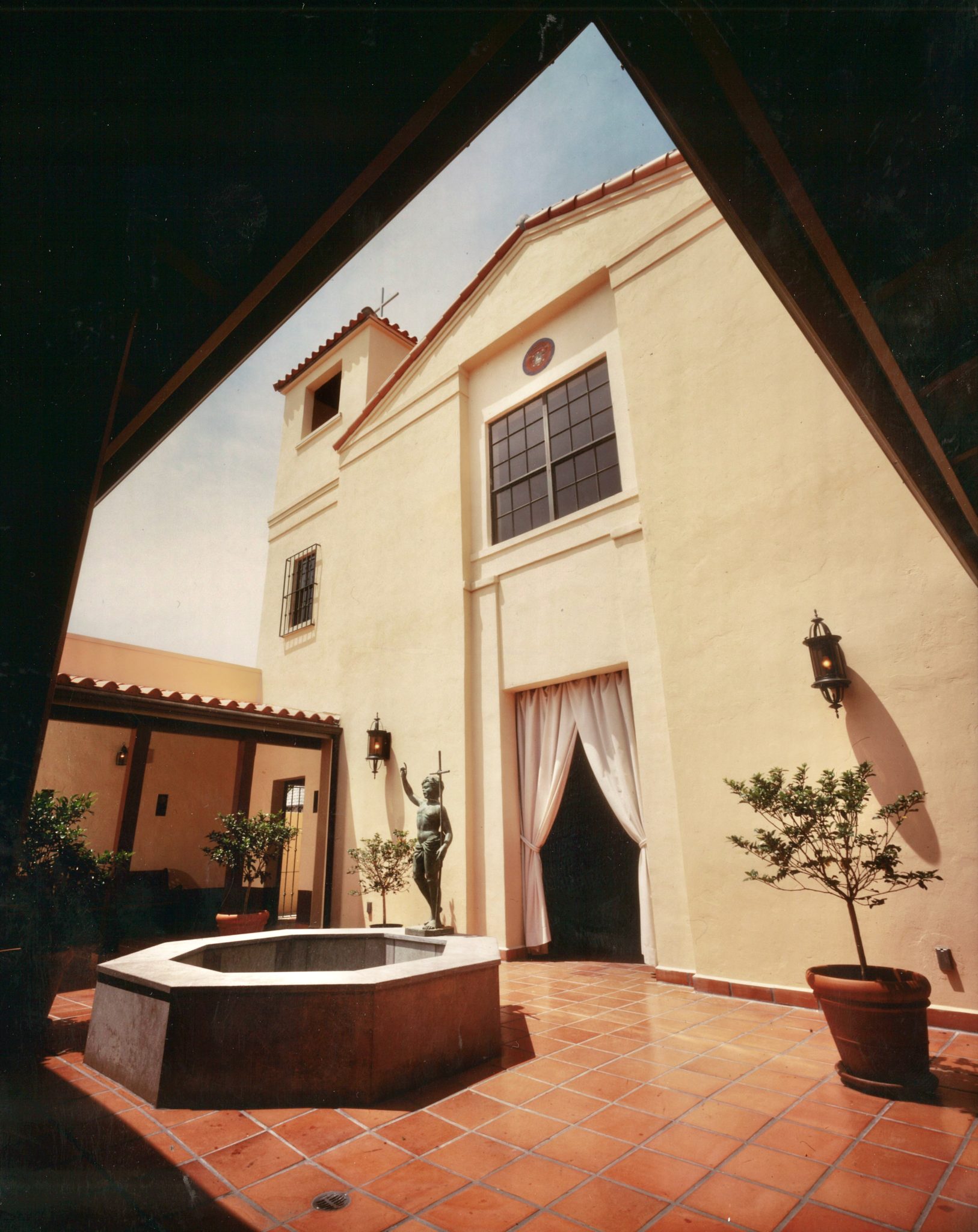 The building’s design clearly alludes to the traditional neighborhood churches of Latin America and the Caribbean, offering a courtyard as a refuge from the hectic urban environment outside. Located on a 50 ft x 104 ft lot, the building makes optimum use of its site with minimum side and rear setbacks and the placement of its front building at the edge of the sidewalk. This single-story wing houses an office and a small chapel. The front facade is a simple wall with modest decoration framing the entrance opening. The zaguan is a shaded vestibule that connects the street to a sun-lit, cloistered courtyard containing an octagonal baptismal fountain and a bell tower. The inner nave of the small church is in the shape of a cruciform with a centrally positioned altar. Large clerestory windows flood the space with light, and a figurative ceiling mural by a local artist provides a strong ornamental feature.