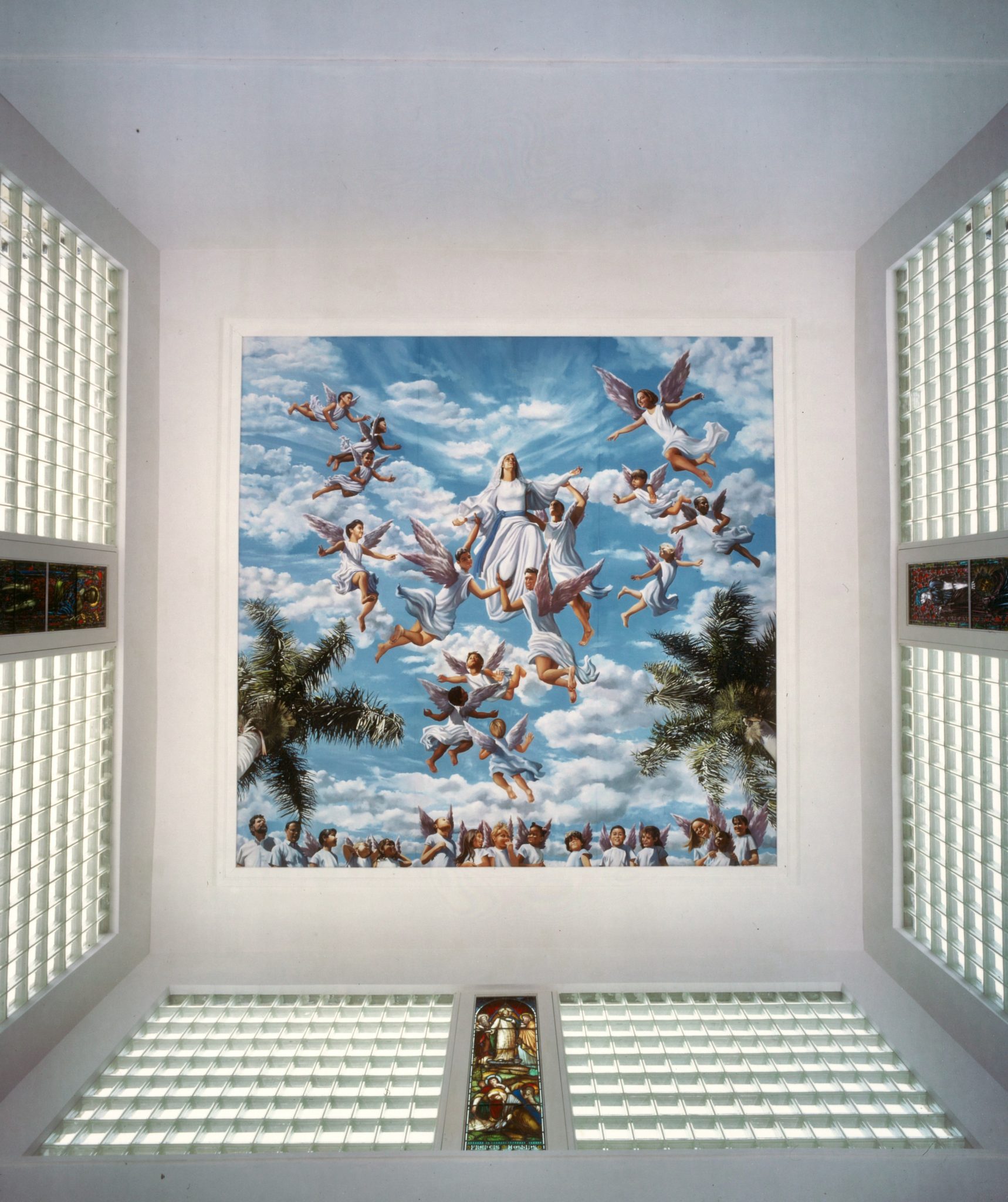 An art collection, curated by the pastor, represents the symbolic religious journey from the profane to the sacred. One begins in the desert, with the gravel frontage overlooked by a relief of St. John; enters the building renouncing original sin by stepping on a mosaic of the Garden of Eden's snake; encounters baptismal cleansing at the fountain, with a statue of St. John the Baptist reminding us of his role in the initiation of the sacrament; proceeds into the sanctuary where clerestories invite one to look at the ceiling, a large canvas representing the celestial goal of the journey, with many of the painted figures portraits of the pastor and his angelic volunteers
